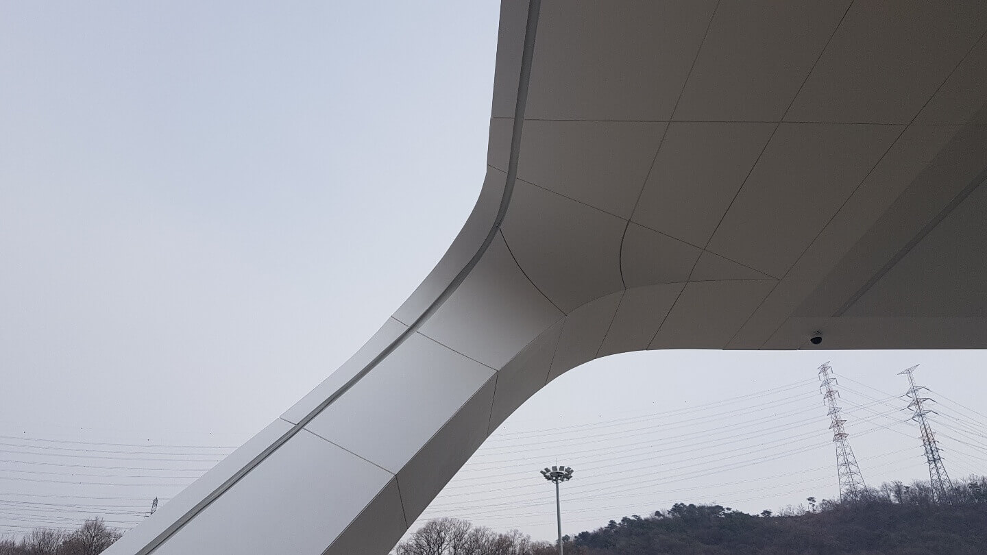 The Hyundai EV Station project challenged us to bring complex double‑curved geometry to life using engineered stone cladding, a material rarely applied to such freeform surfaces.